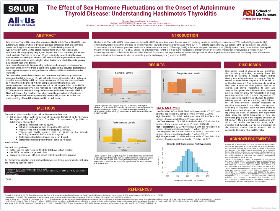 Our research explores how different sex hormones and coinciding levels are associated with the onset of HT. We will note the genetic markers that indicate a possible susceptibility to HT and the measurement of their sex hormone levels; as well as those diagnosed with HT, comparable genetic markers, and measurement of their sex hormones. We will be utilizing the All of Us and NCBI databases to help identify genetic markers as related to autoimmune thyroiditis/HT. We anticipate that fluctuating sex hormones will affect the onset of HT in AFAB individuals. The results of this study could help medical professionals treat and prevent HT in those genetically susceptible, as well as further the understanding of how HT activates within an individual.