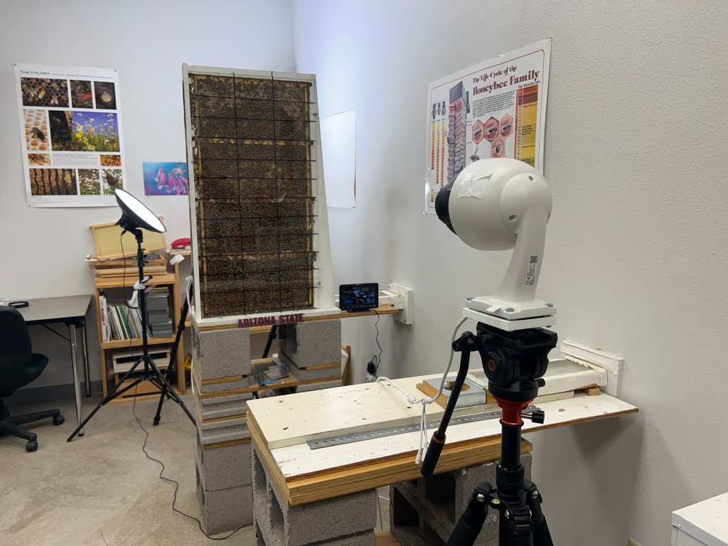 The Bee Annex at Arizona State University’s Polytechnic campus houses the observation hive which is constructed of four 9 and 1/8 inch long by 19 inch wide pine wood frames stacked on top of each other with combs facing outward, covered with acrylic plates to allow for easy viewing and recording. The four story observation hive utilizes a tunnel at the bottom of the hive, connecting it to the outside of the building. Our hive is populated by honey bees, commonly known as Italian bees, or Apis mellifera ligustica. For the purposes of this experiment, the queen bee has been marked by a yellow dot on her back.