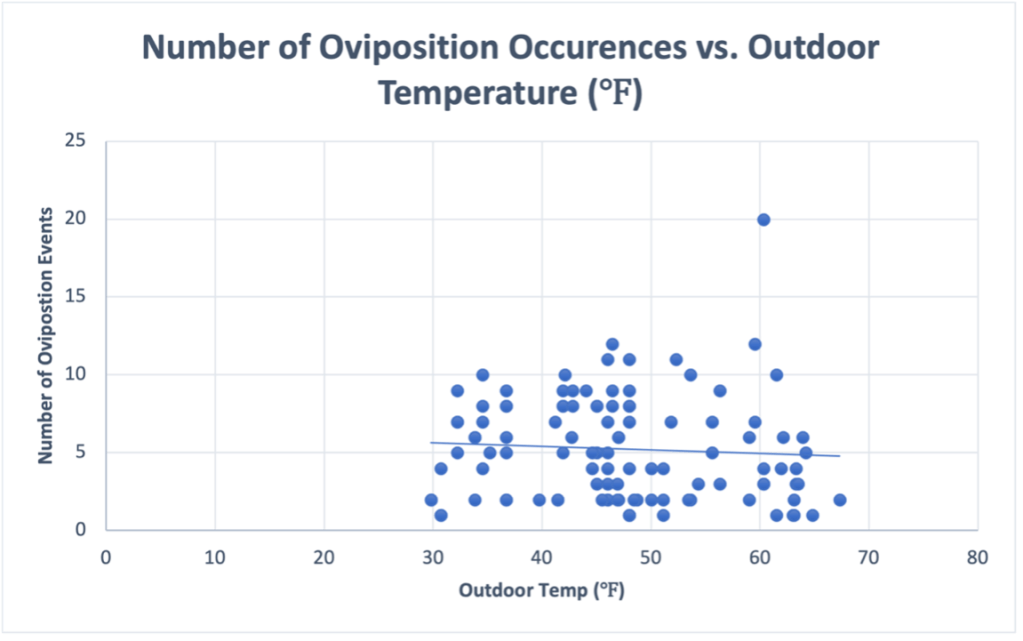 The Queen honeybee is shown to maintain an oviposition rate that varies very little during mild temperature changes. Due to the limitations of the lab and the subsequent set up, as well as time constraints, we were unable to get a fully conclusive data set; however, as can be seen in Figures 2 and 3, there is a slight trend showing her ability to lay eggs regularly without effect from the temperature changes as we have seen thus far. Data collected varies from 29°F to 70°F, at random time intervals. The queen averaged approximately 5 oviposition events over the 41°F difference and shows little change in ovipositing behavior during this time. This lack of variation leads to the belief that there is much more data to be collected over a longer time period.