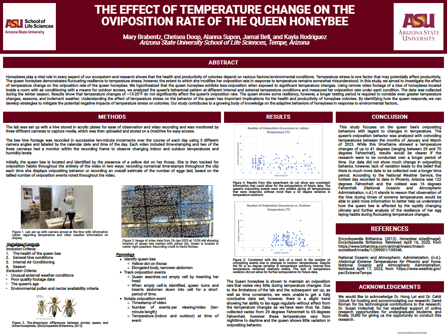In 2022, the National Oceanic and Atmospheric Administration reported that it was the sixth warmest year on record, with the Earth’s surface temperature averaging 1.55°F warmer than the last century. The entirety of the world, with the exception of only a few locations, has seen a significant change in the last 20 years. (Lindsey & Dahlmen, 2023) Meanwhile, honeybees are the most frequent floral visitor of crops worldwide, and they are the sole visitor of 4% of recorded plant species. (Hung et al., 2018) According to the USDA-National Agricultural Statistics Service, honeybees pollinate $15 billion worth of crops in the United States alone and produce $3.2 million of honey harvested for human consumption. (USDA, n.d.) Based on the aforementioned statistics, honeybees maintain an integral space in human economics and global ecosystems. Some research has shown that changes in weather affects honeybee activity (Karbassioon et al., 2023), while others show that temperature stress shows no significant effect on queen honeybee behaviors. (McAfee, 2021) In this study, we focus on the possible changes in queen honeybee oviposition rates. An observation hive was set up along with cameras for recording purposes. During this time, egg laying behaviors and their corresponding temperatures were recorded and analyzed. Our findings were inconclusive with temperatures ranging from 29°F to 70°F, as queen bee oviposition did not vary within this time frame, leading to the belief that there is more information to be gathered from further observation.
